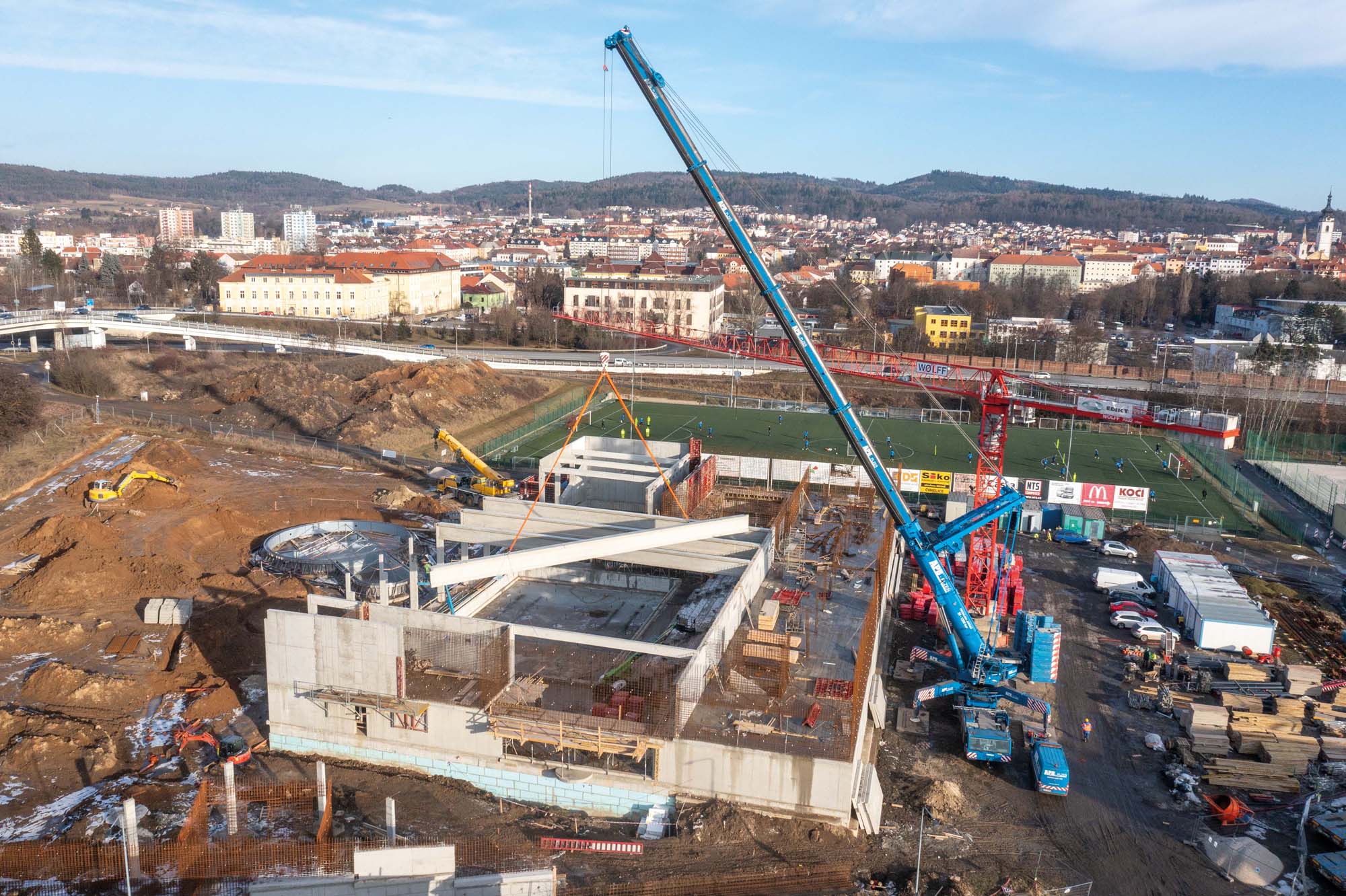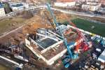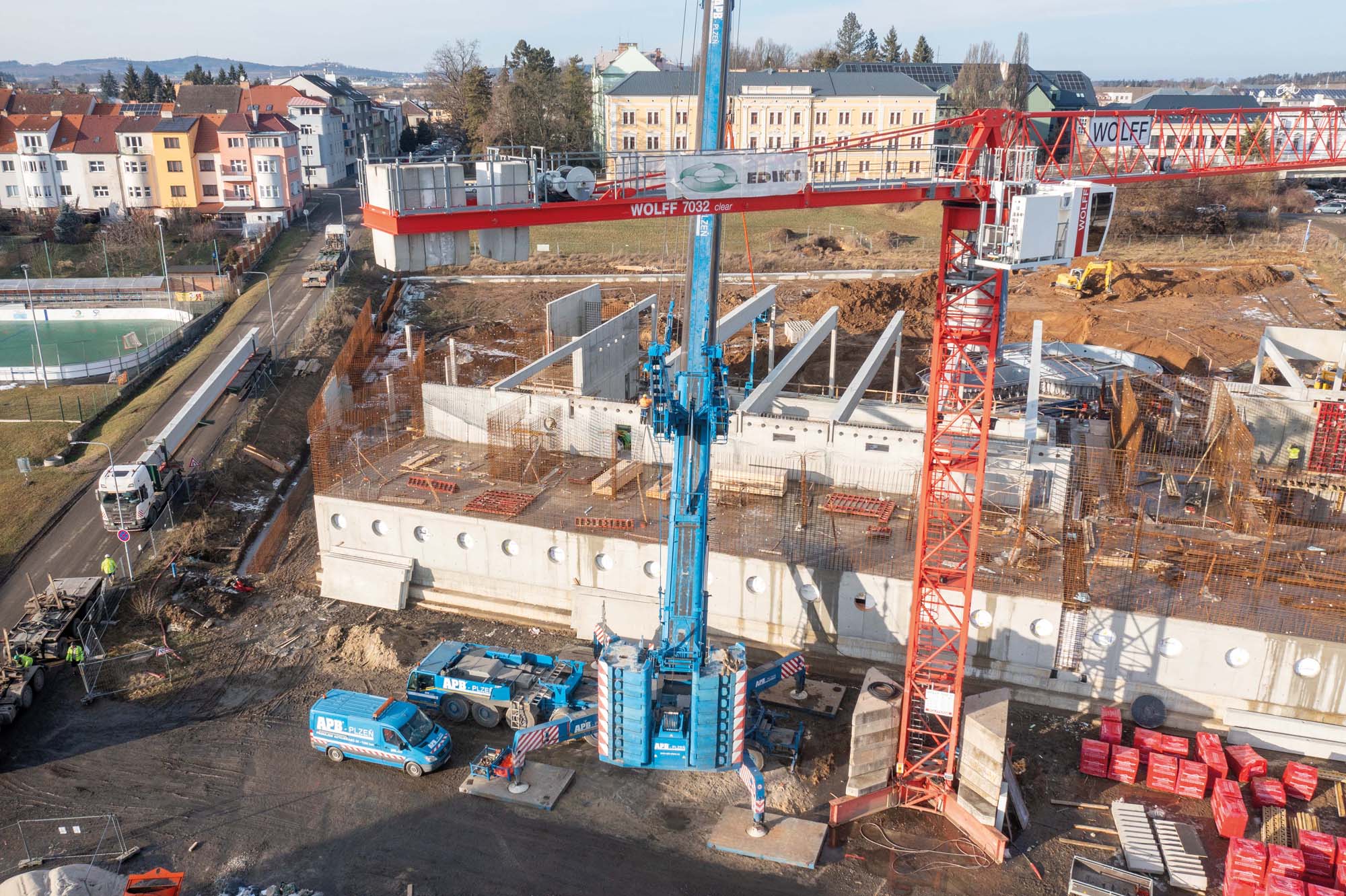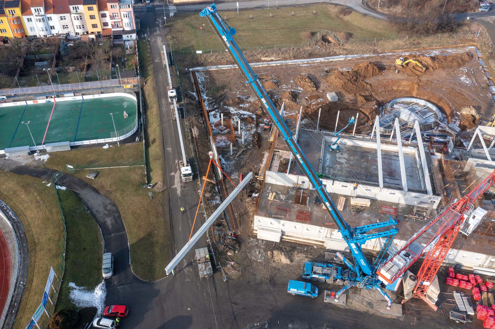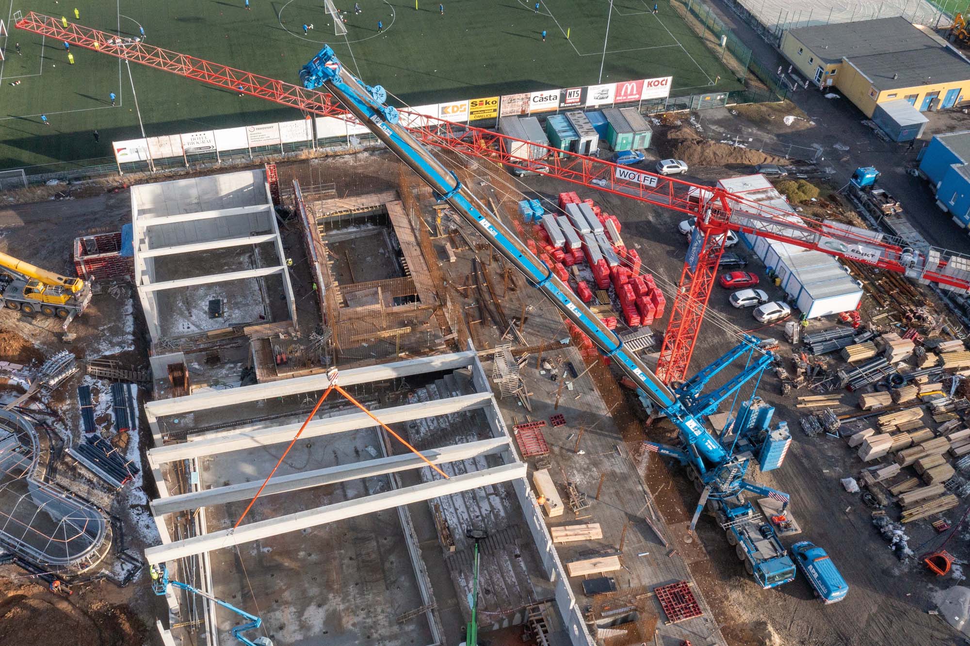 Demag AC 500 v akci: 6 nosníků | 26 tun | 30 m. Další krok stavby hotov.
