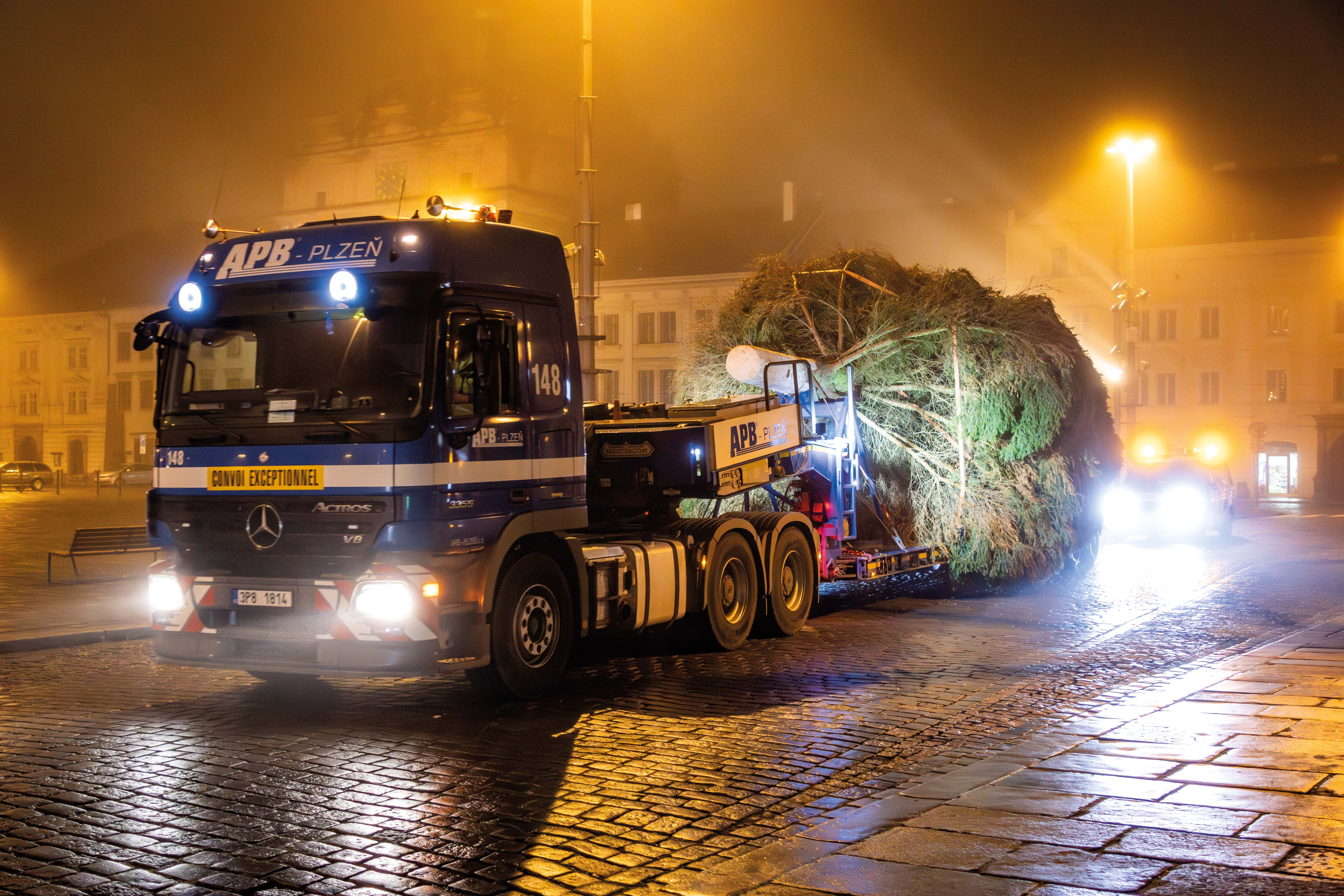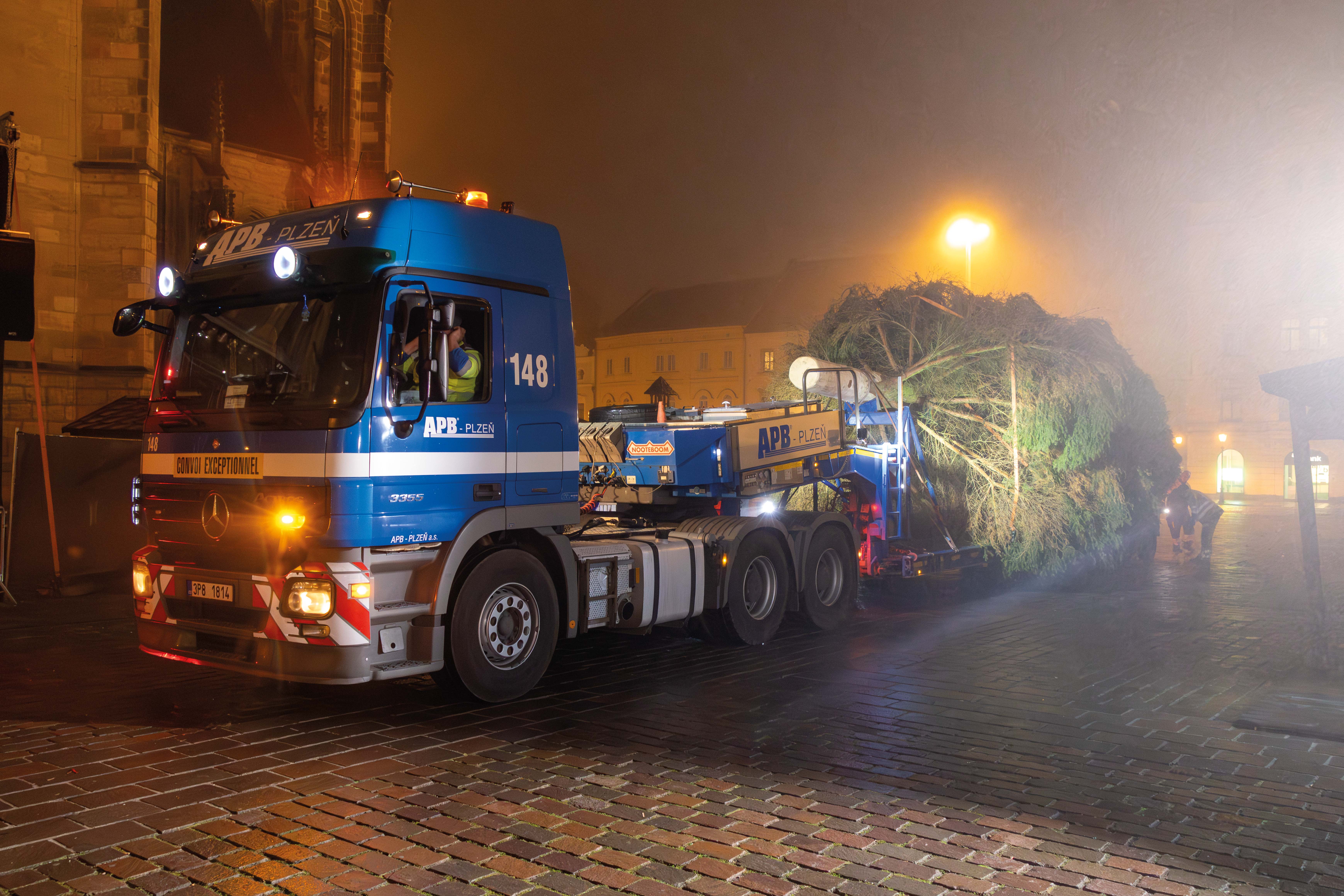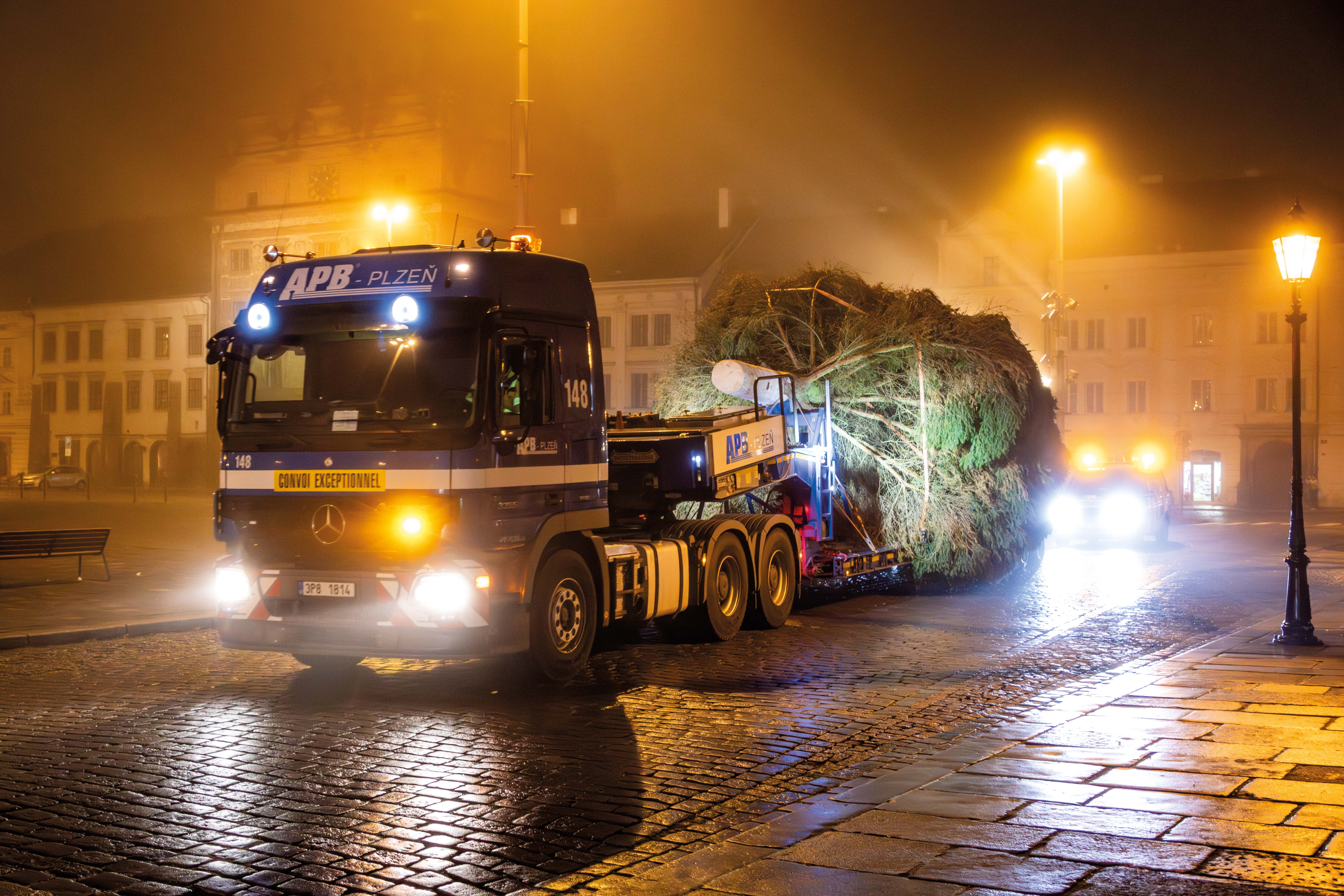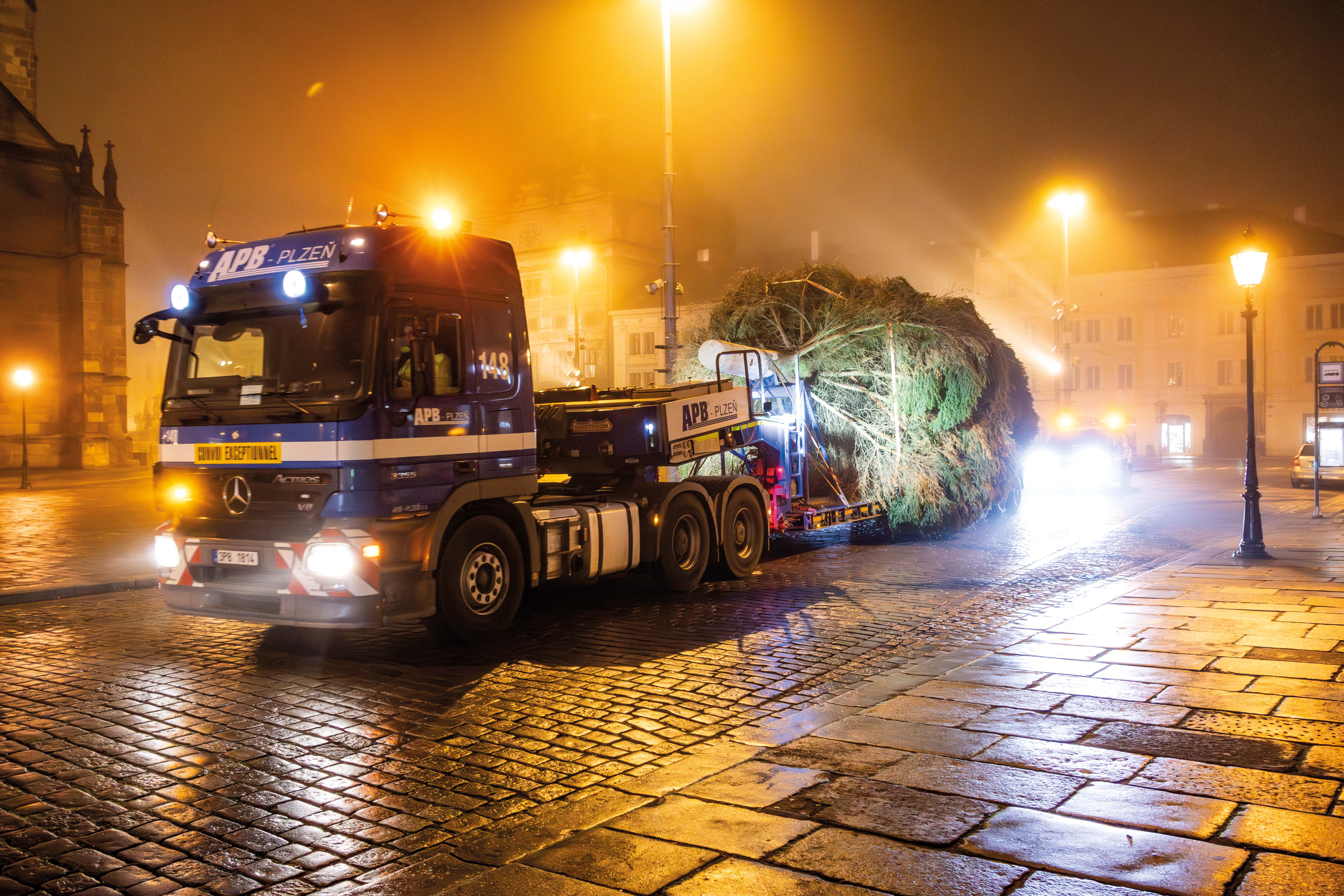 Cesta letošního vánočního stromu do Plzně začala ve Stodě, kde jsme pečlivě připravili nádherný smrk ztepilý pro svou slavnostní cestu. Pomocí výkonného autojeřábu LIEBHERR LTM 1070 jsme strom bezpečně naložili na podvalník a vydali se s ním směrem na plzeňské náměstí Republiky.