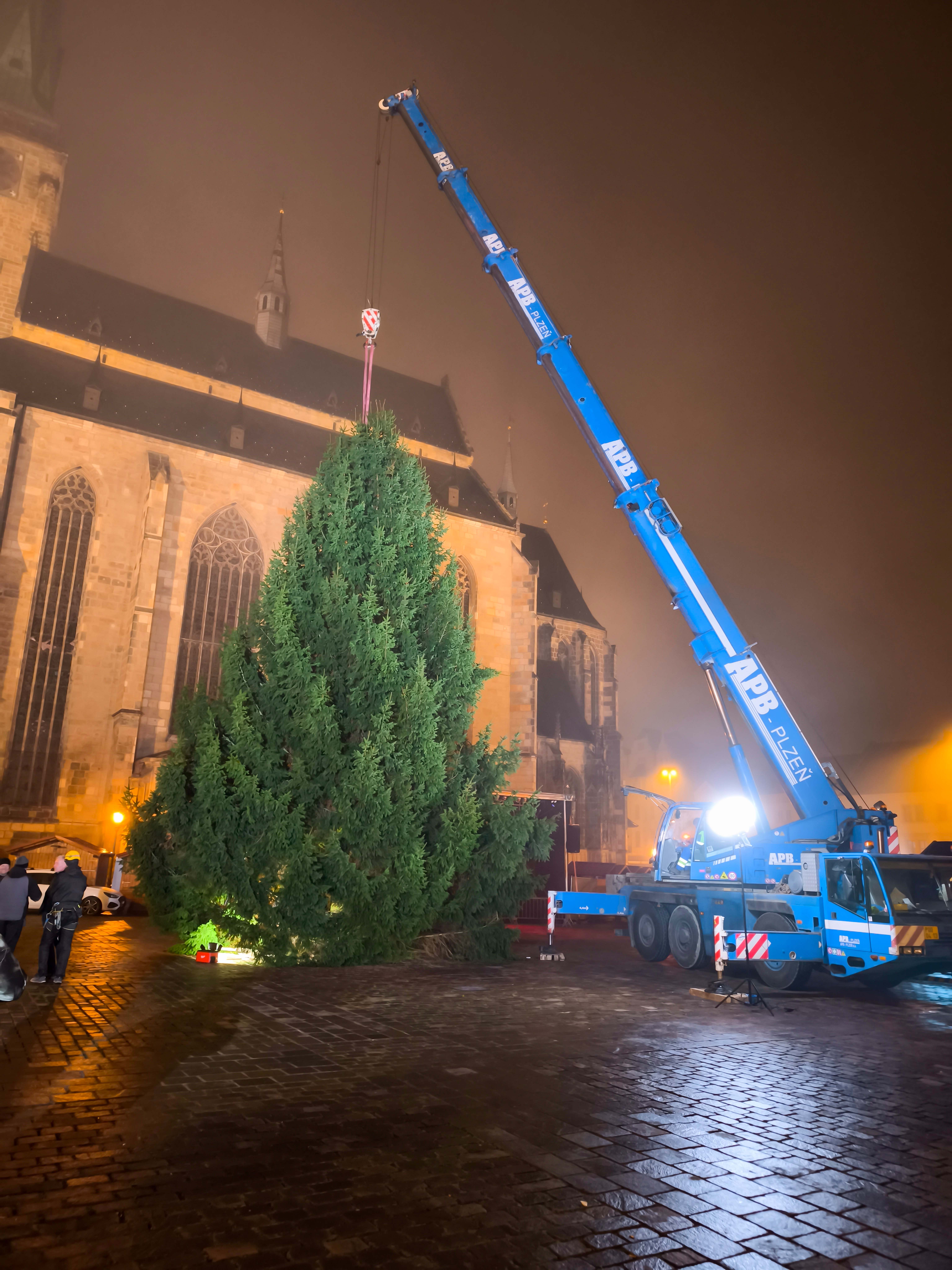 Po příjezdu do centra města se do práce pustil náš autojeřáb AC 50, který s maximální přesností usadil majestátní smrk do připravené šachty. Celá akce proběhla bez komplikací, a tak může tento krásný symbol Vánoc rozzářit srdce všech Plzeňanů i návštěvníků města.