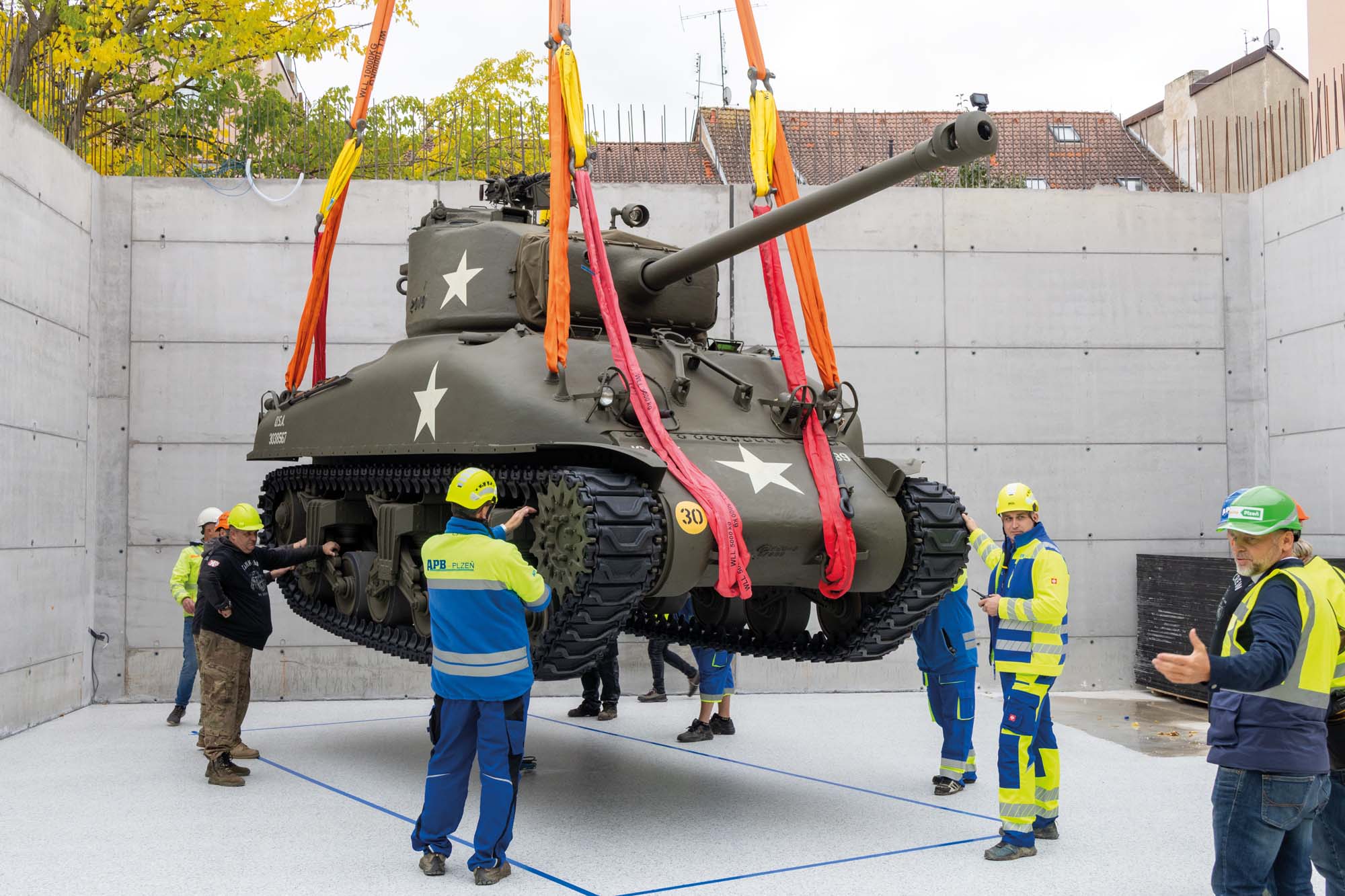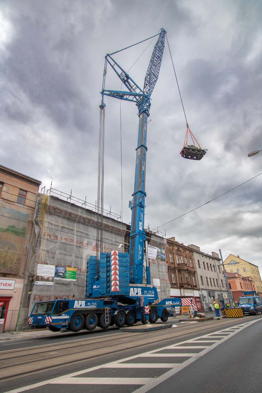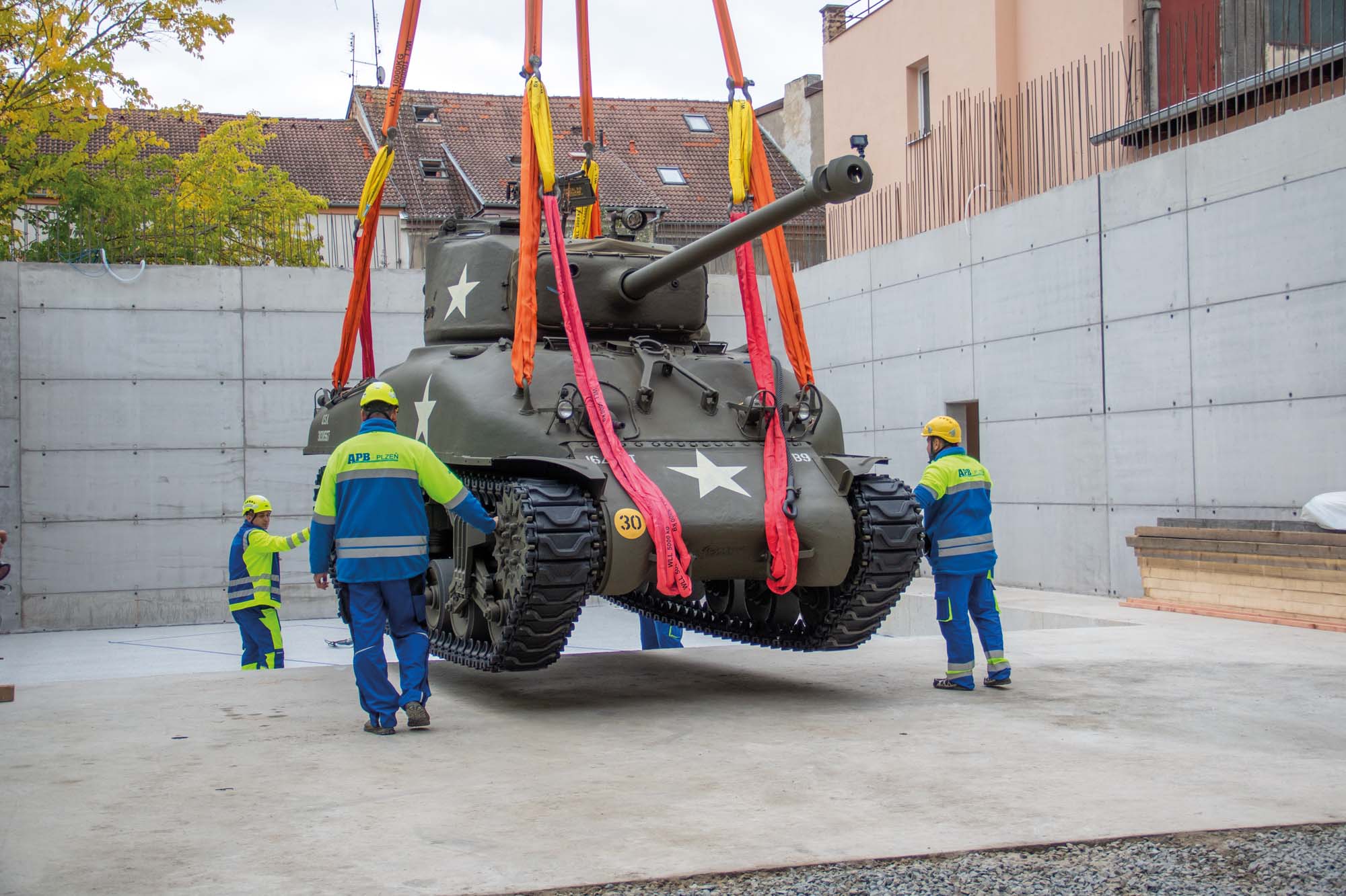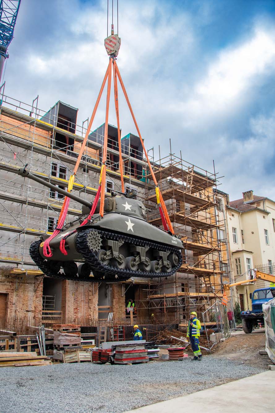 Zajistili jsme transport amerického tanku Sherman M4 do Plzně na Klatovskou třídu. Zde pomocí jeřábu AC 500 jsme přesunuli legendární tank Sherman M4 přes střechu domu na Klatovské 19.