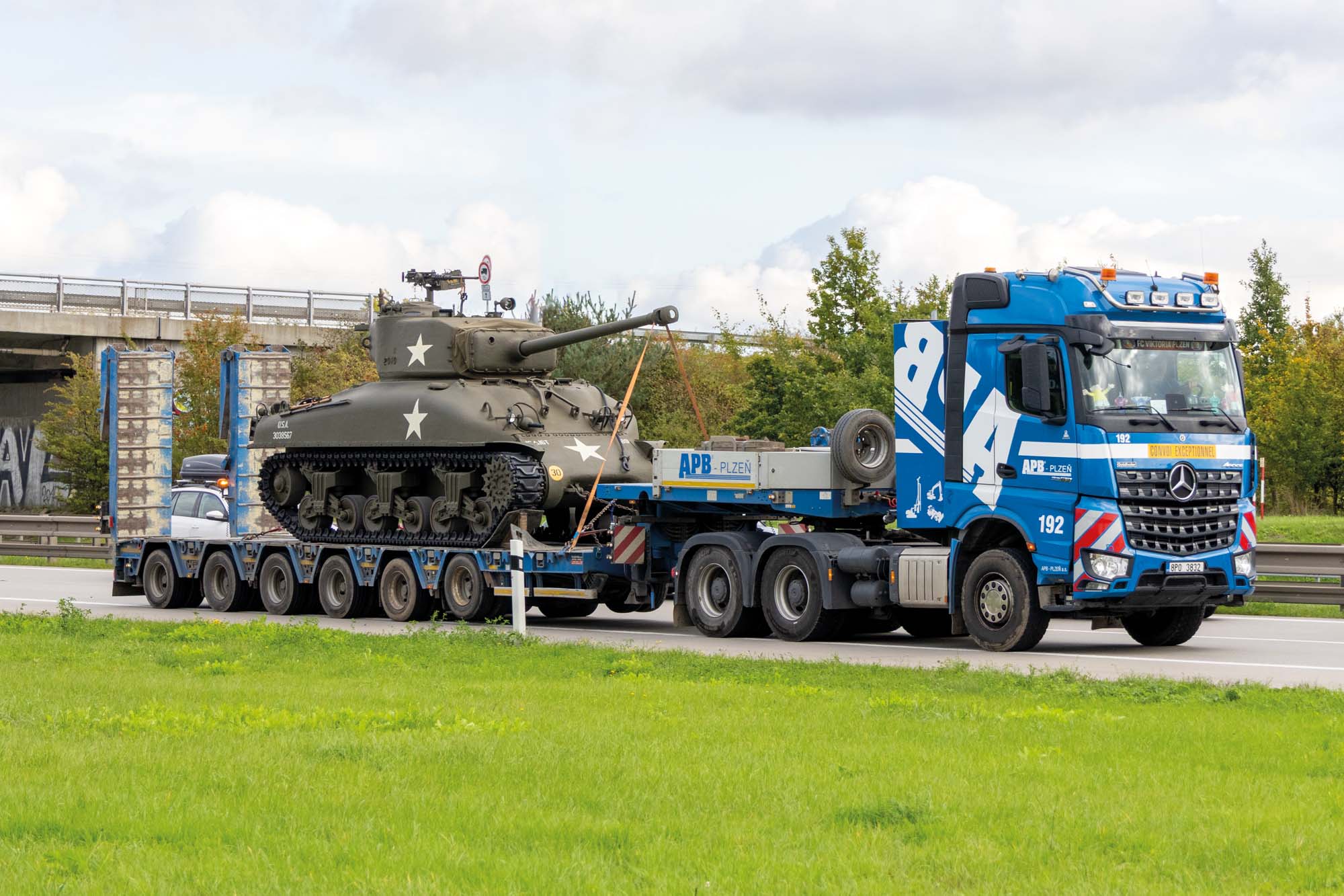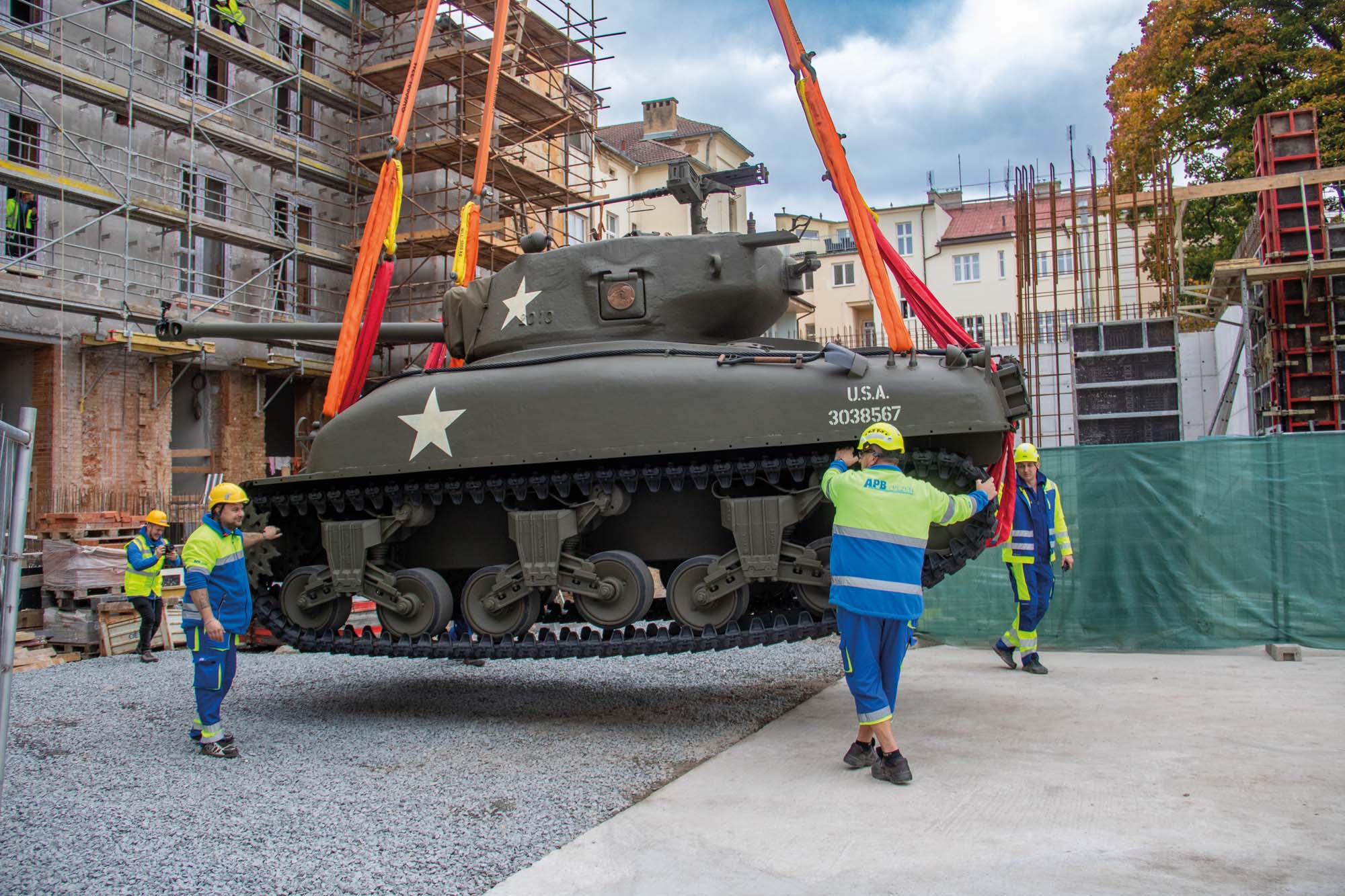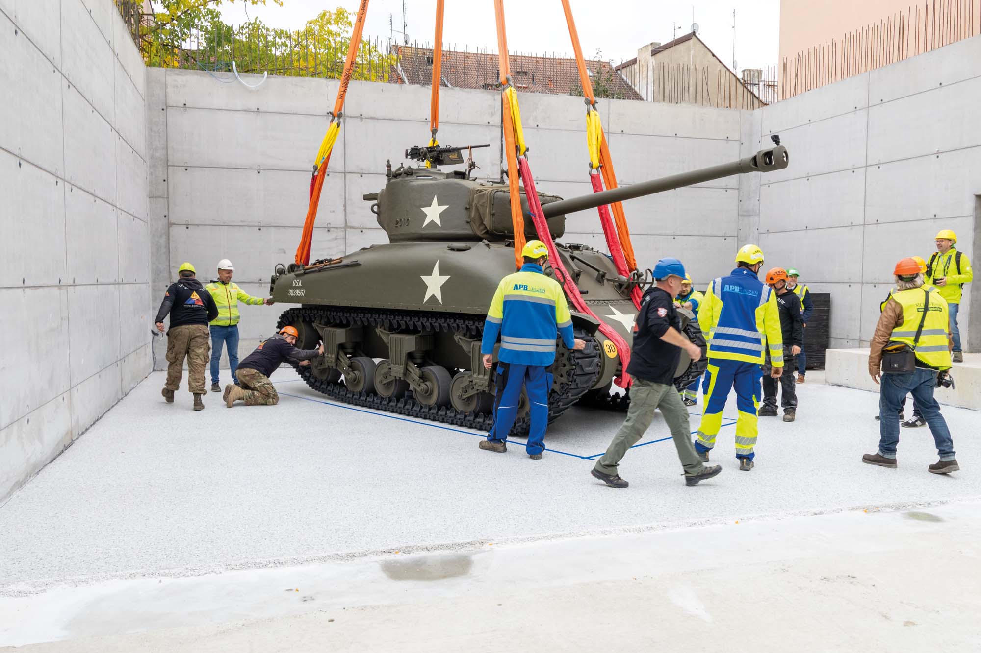 Zajistili jsme transport amerického tanku Sherman M4 do Plzně na Klatovskou třídu. Zde pomocí jeřábu AC 500 jsme přesunuli legendární tank Sherman M4 přes střechu domu na Klatovské 19.