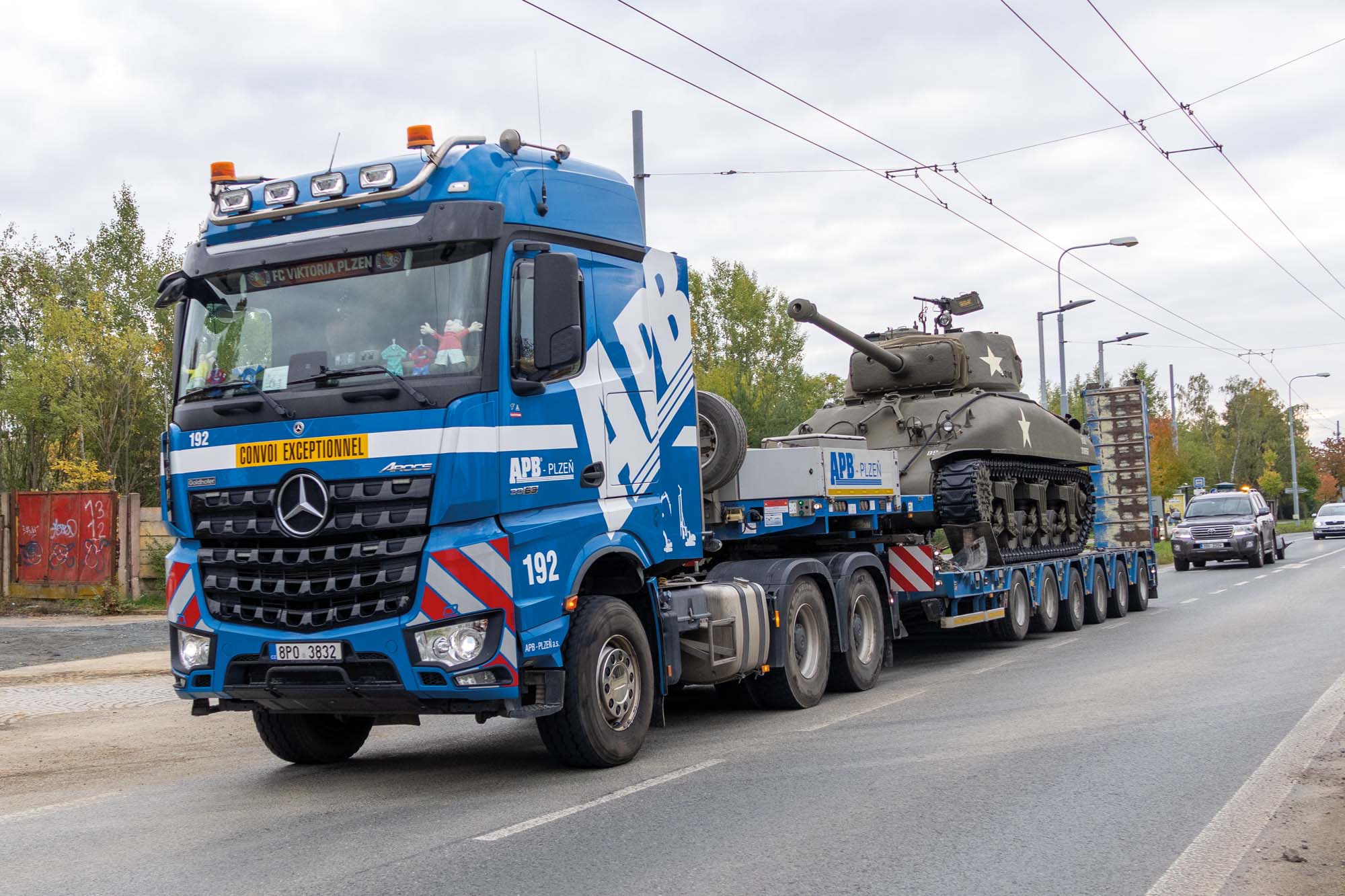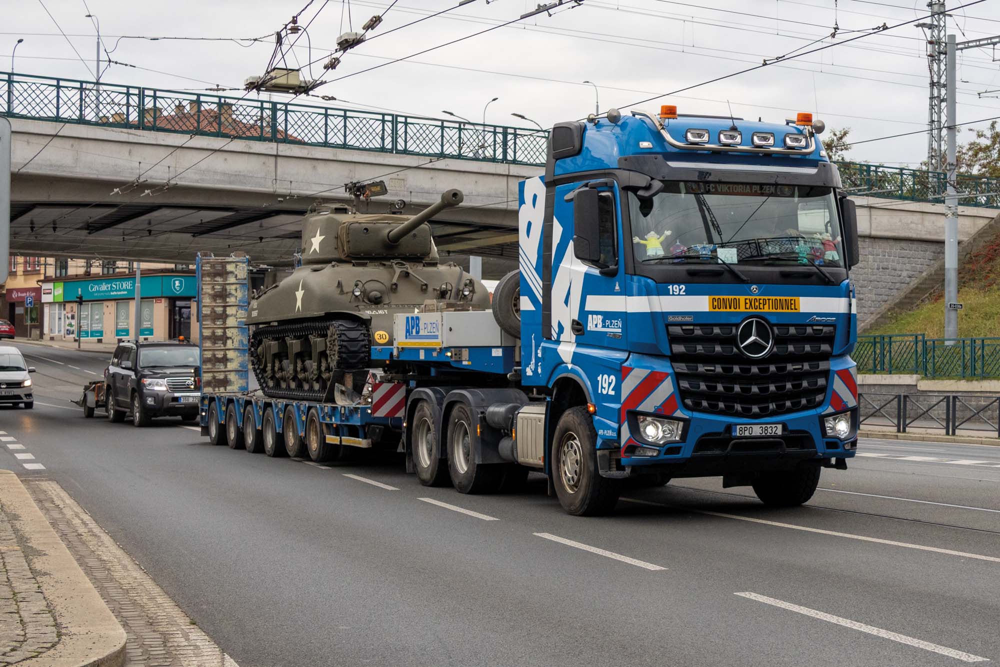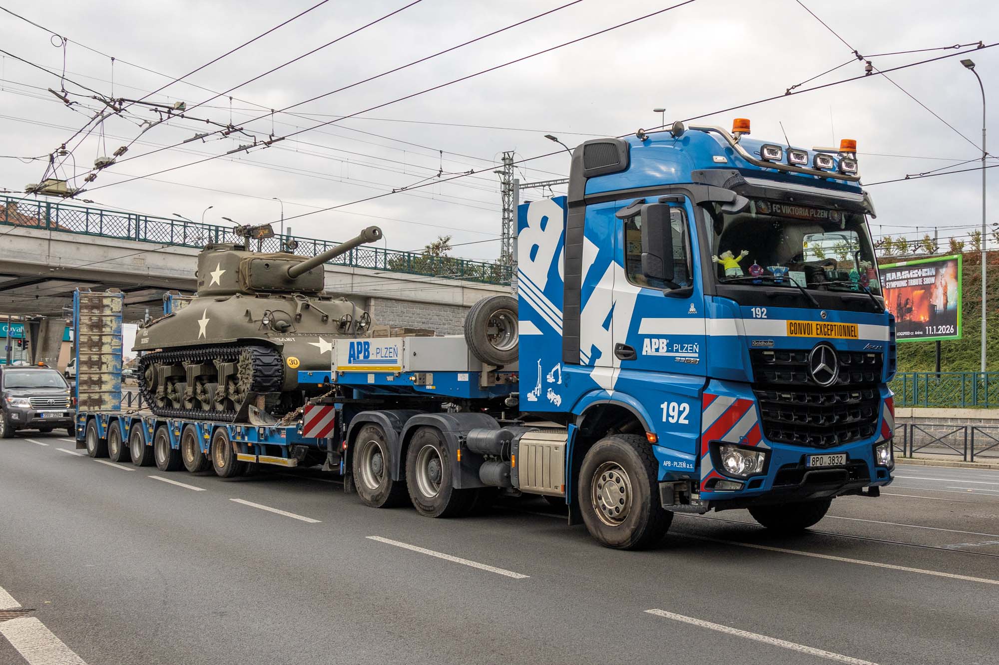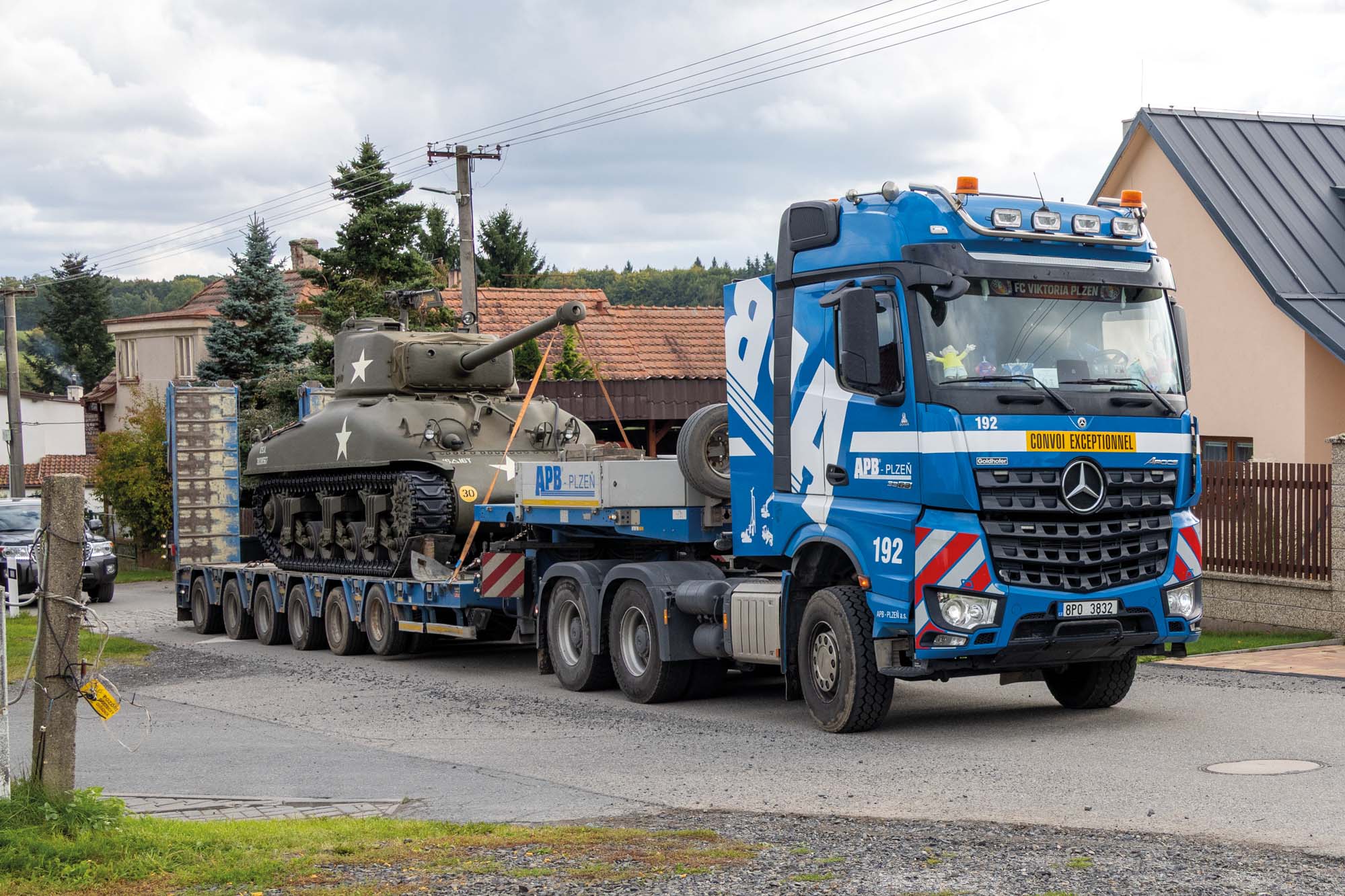 Zajistili jsme transport amerického tanku Sherman M4 do Plzně na Klatovskou třídu. Zde pomocí jeřábu AC 500 jsme přesunuli legendární tank Sherman M4 přes střechu domu na Klatovské 19.